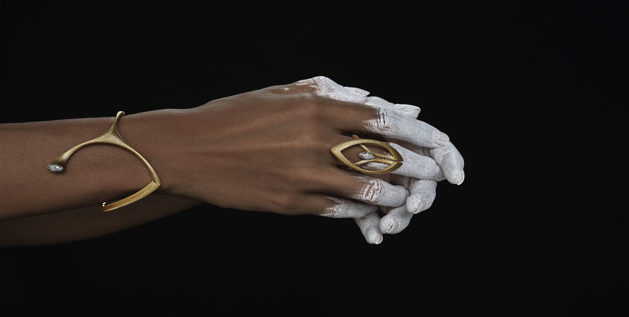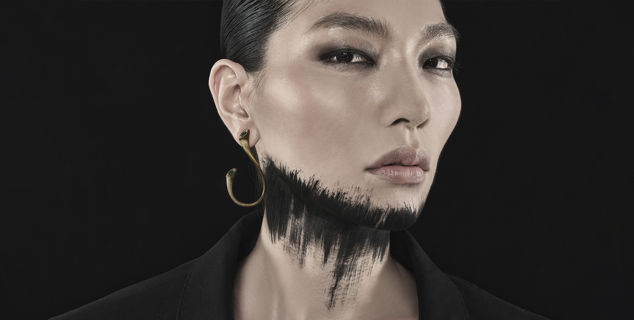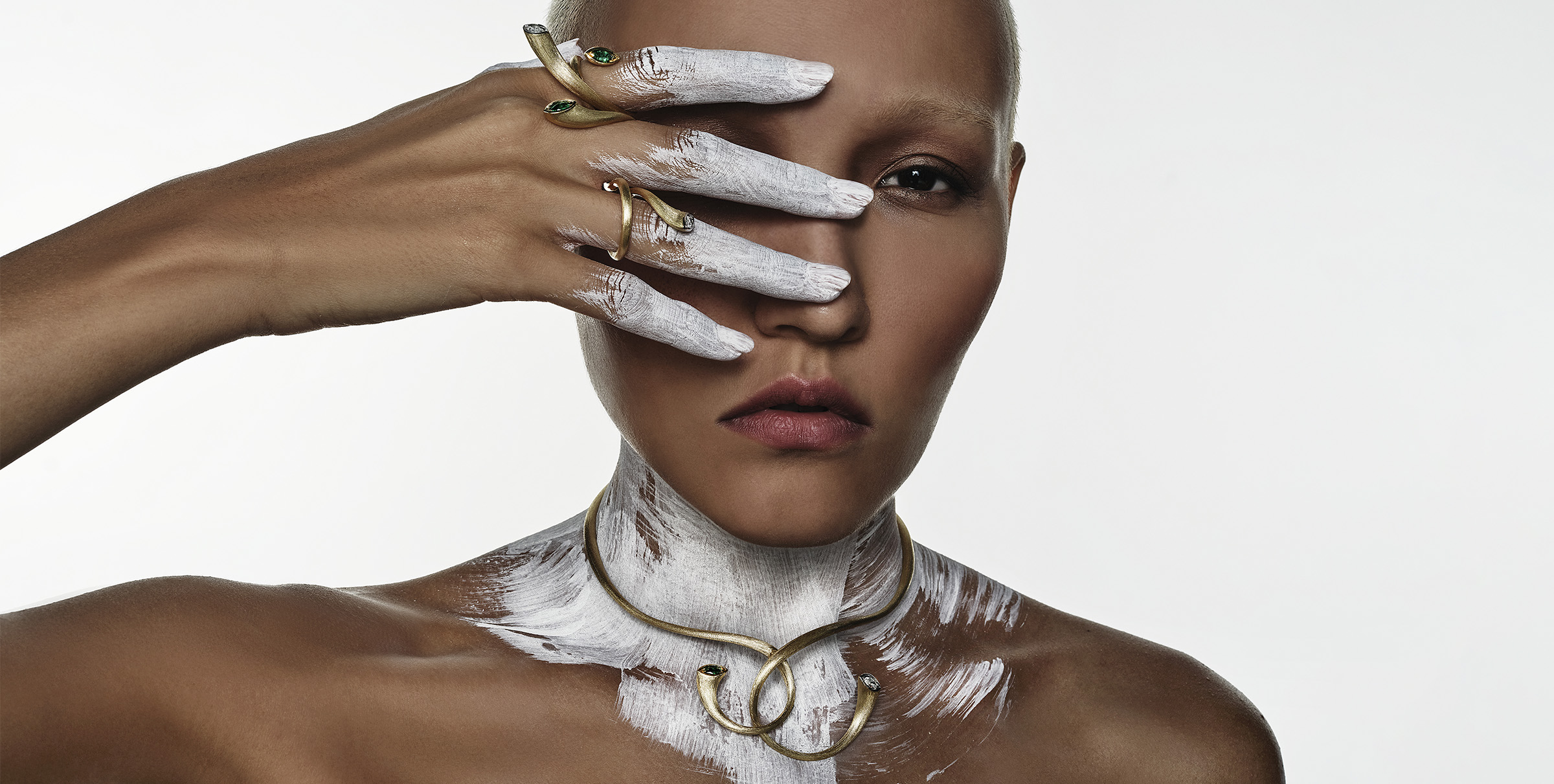 Crafted from ethically sourced 18k gold, the collection features striking marquise diamonds and vivid emeralds, their contrast echoing the balance between purity and passion. Sculptural necklaces and earrings curve in divine arcs, invoking the celestial form of Shiva’s weapon and the energy it represents.