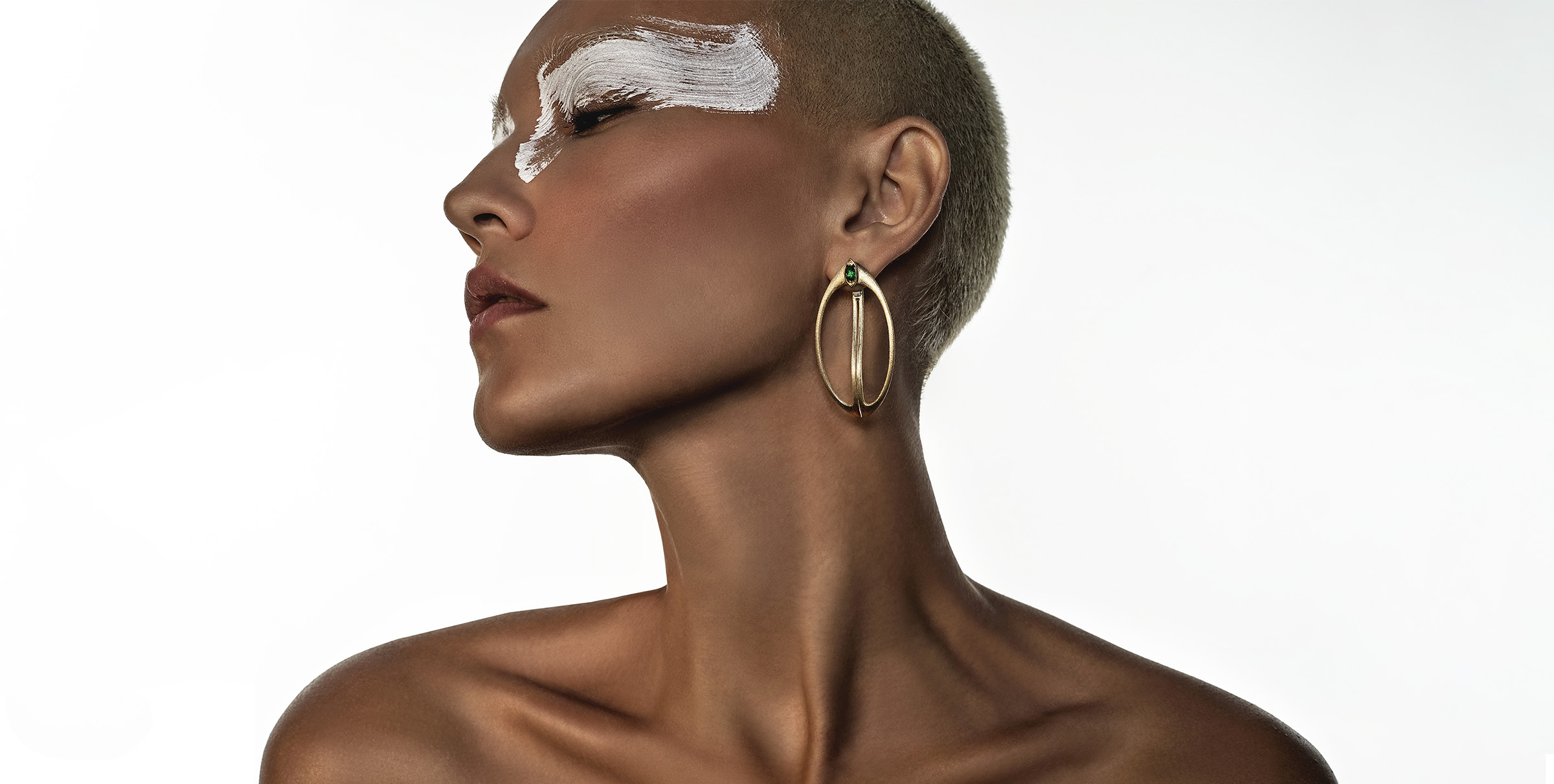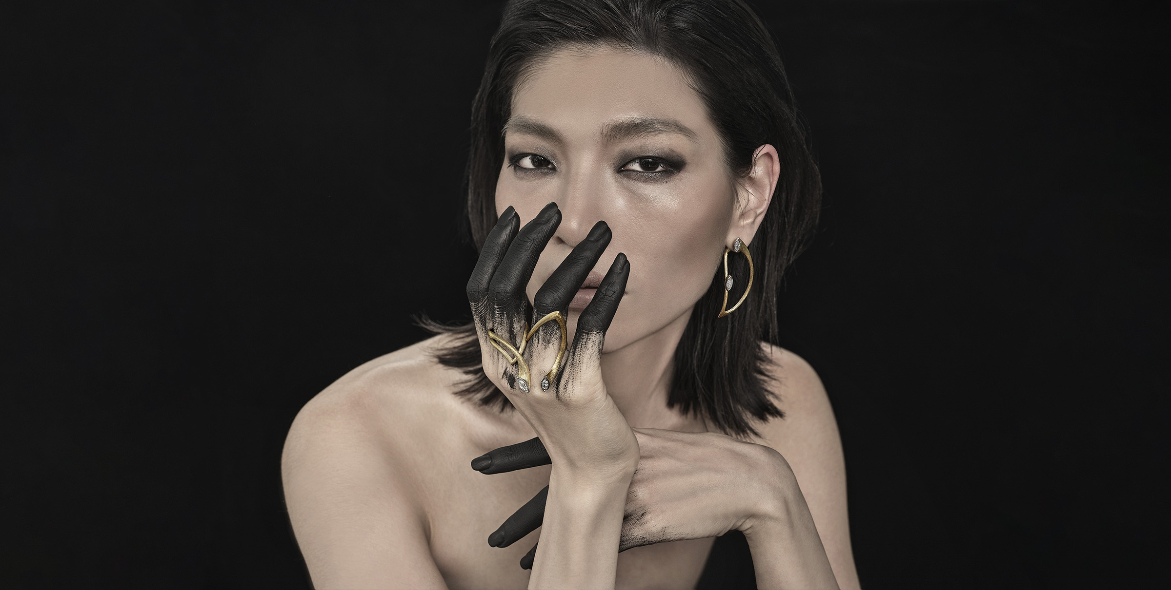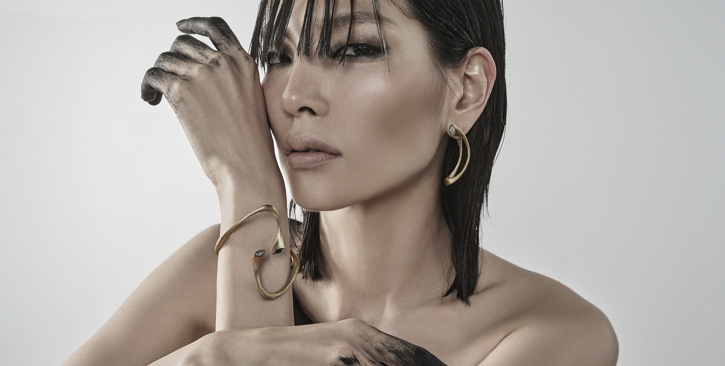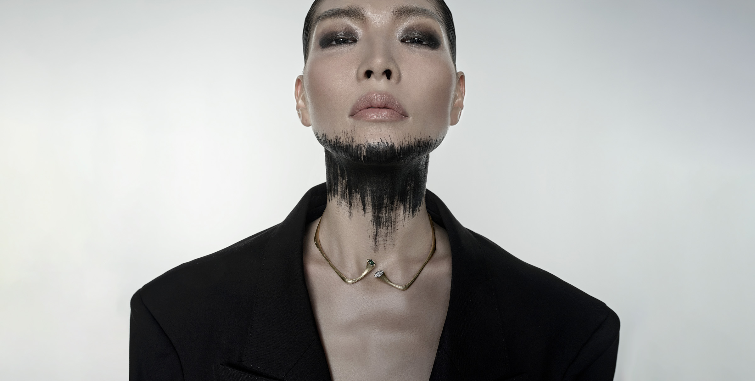 Crafted from ethically sourced 18k gold, the collection features striking marquise diamonds and vivid emeralds, their contrast echoing the balance between purity and passion. Sculptural necklaces and earrings curve in divine arcs, invoking the celestial form of Shiva’s weapon and the energy it represents.